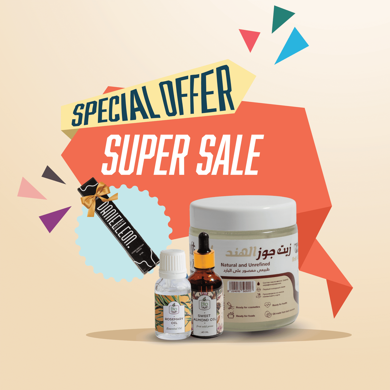 باكيدج الزيوت التجميلية الأكثر مبيعًا التي تضم زيت جوز الهند، زيت الروزماري، و زيت اللوز الحلو، هي مزيج طبيعي بالكامل تم تصميمه لتلبية جميع احتياجات البشرة والشعر. تجمع هذه الحزمة بين الترطيب العميق والفوائد المنعشة، مما يجعلها خيارًا مثاليًا لكل من يبحث عن جمال طبيعي ونتائج فعّالة.