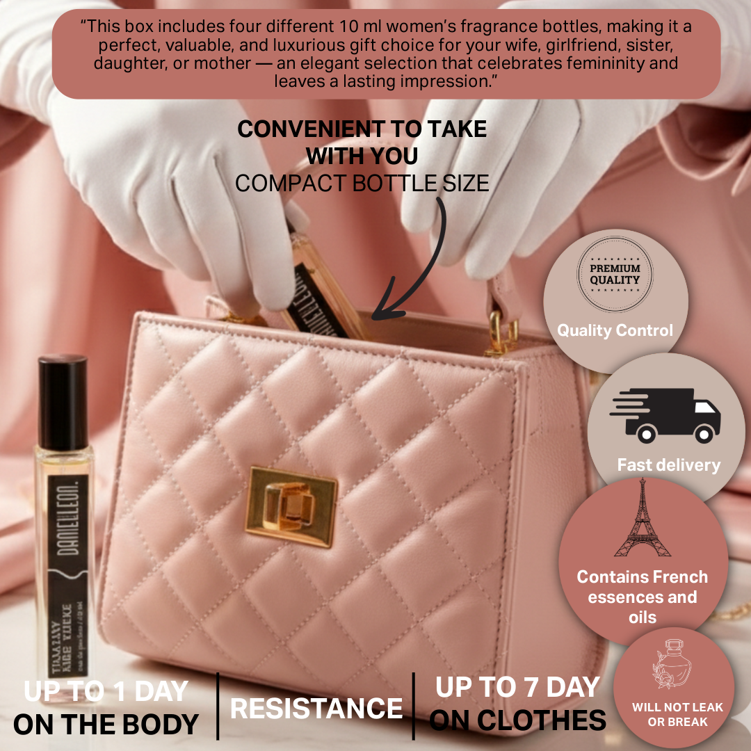 Step into luxury with our exclusive tester pack featuring 4 of the most iconic and irresistible fragrances. Whether you’re exploring our scents, looking for the perfect gift, or need a compact perfume for on-the-go – this package has you covered. – So Sexy – Bold, flirty, and confident. Perfect for turning heads and leaving a lasting impression. – Mademoiselle (Inspired by Coco Mademoiselle) – Fresh, classy, and feminine. A timeless scent for everyday elegance. – Black Opium – Deep, sweet, and addictive. Ideal for nights out and those who love a powerful presence. – Tiziana Terenzi Kirke – Fruity, exotic, and luxurious. A unique scent that stands out in any crowd. – A great way to discover your signature scent!